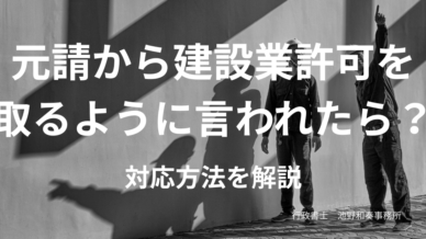 よくある質問・お悩み 元請から建設業許可を取るように言われたら?対応方法を解説【大阪市】 大阪市で建設業許可の取得をお考えの方へ「自分でできるのか不安」「要件を満たしているか分からない」そんな方は、まずはお気軽にご相談ください。\初回相談無料・丸投げOK/無料相談はこちら元請から建設業許可... 2026.04.20 よくある質問・お悩み建設業許可